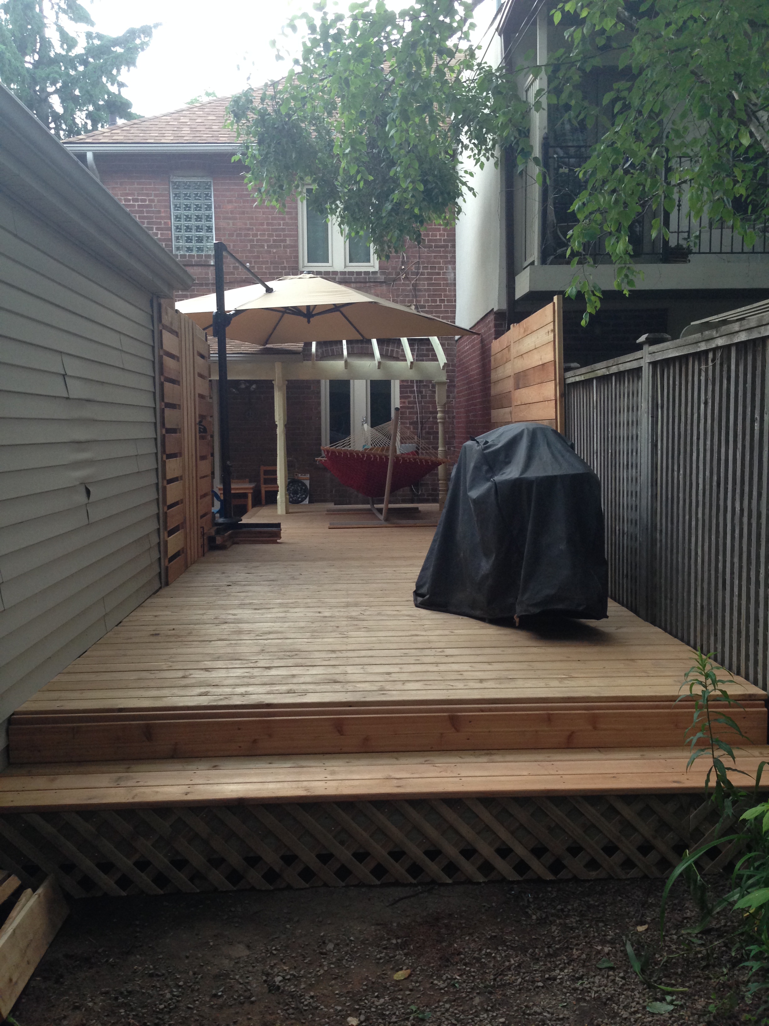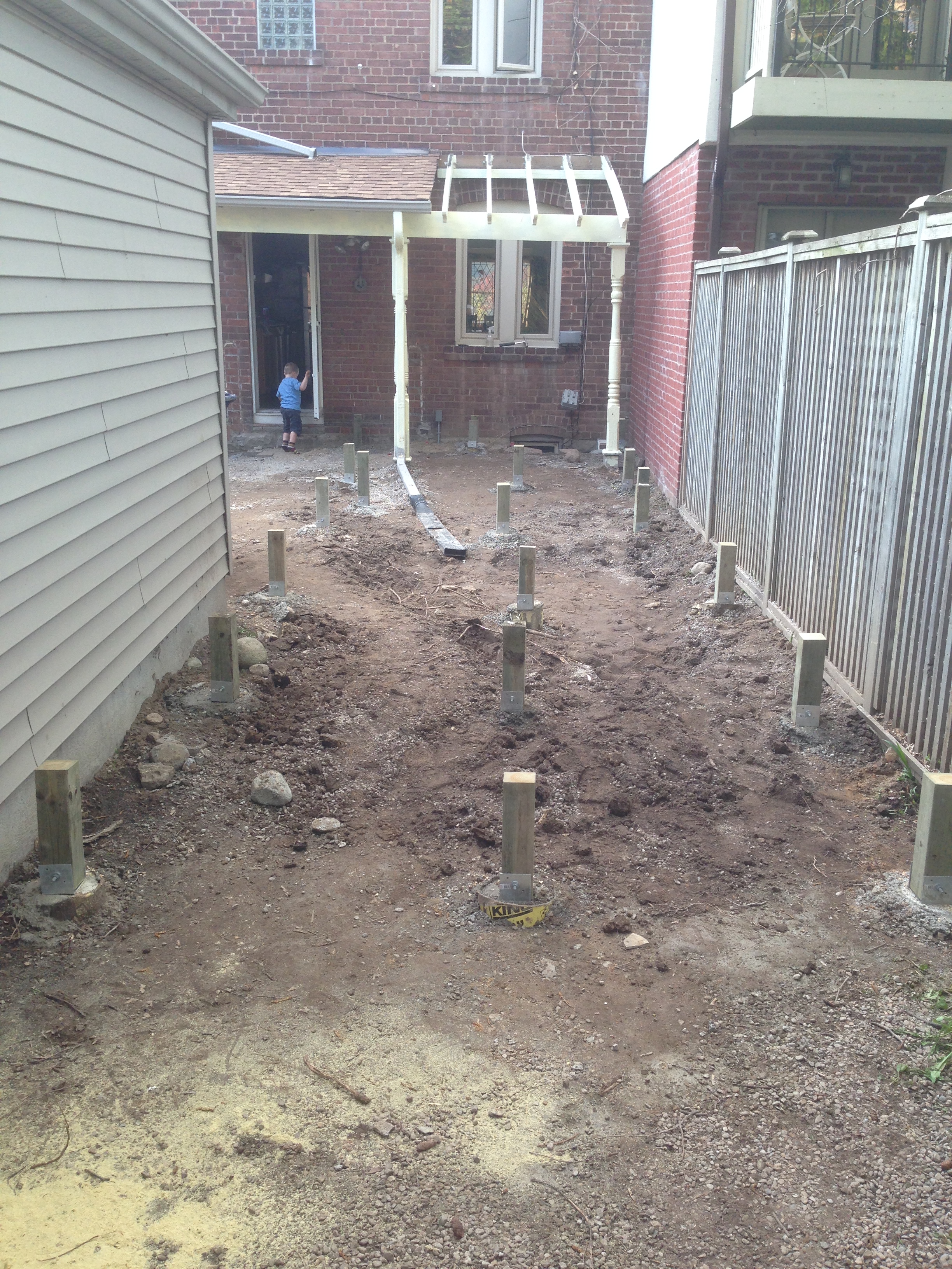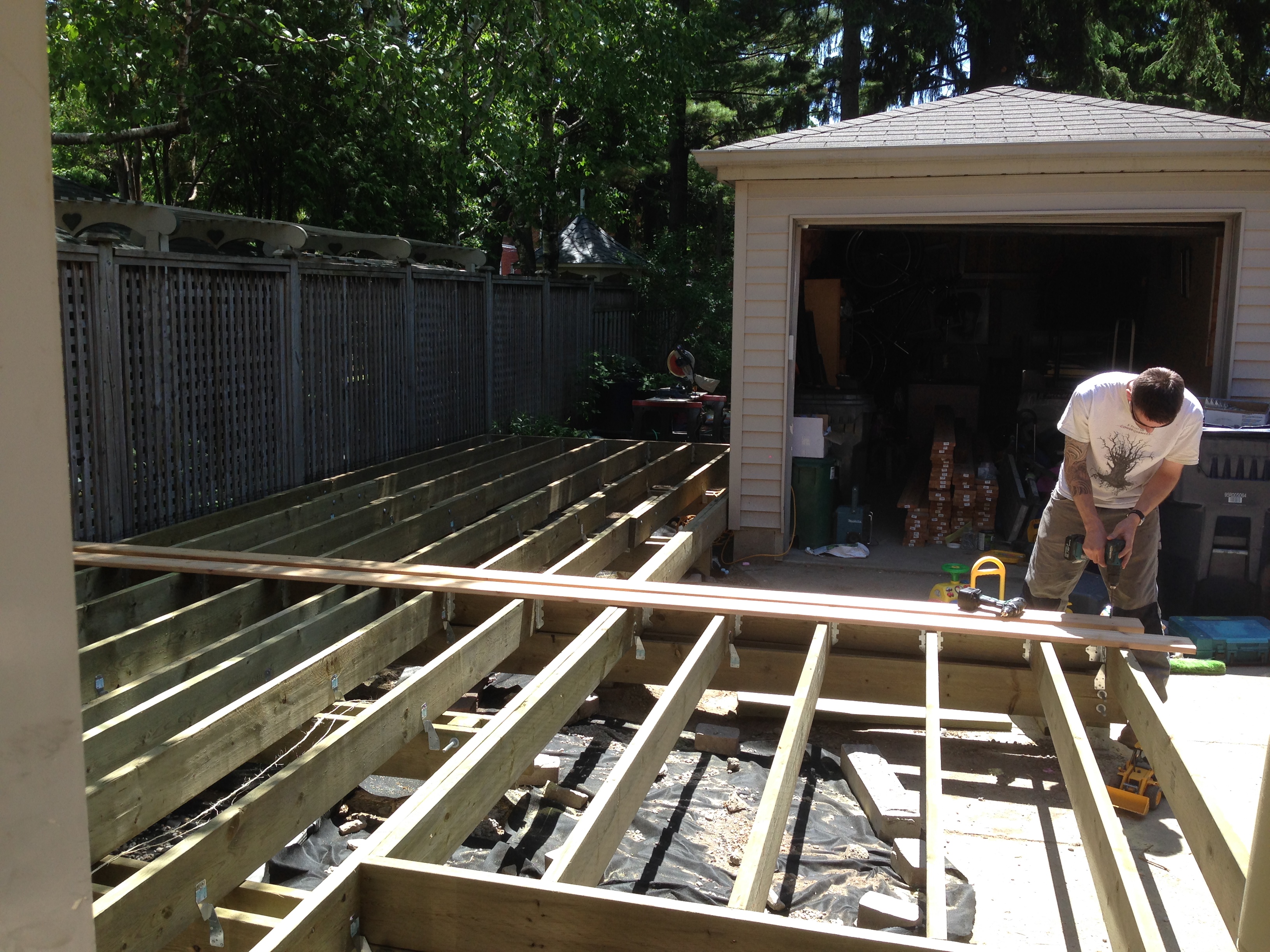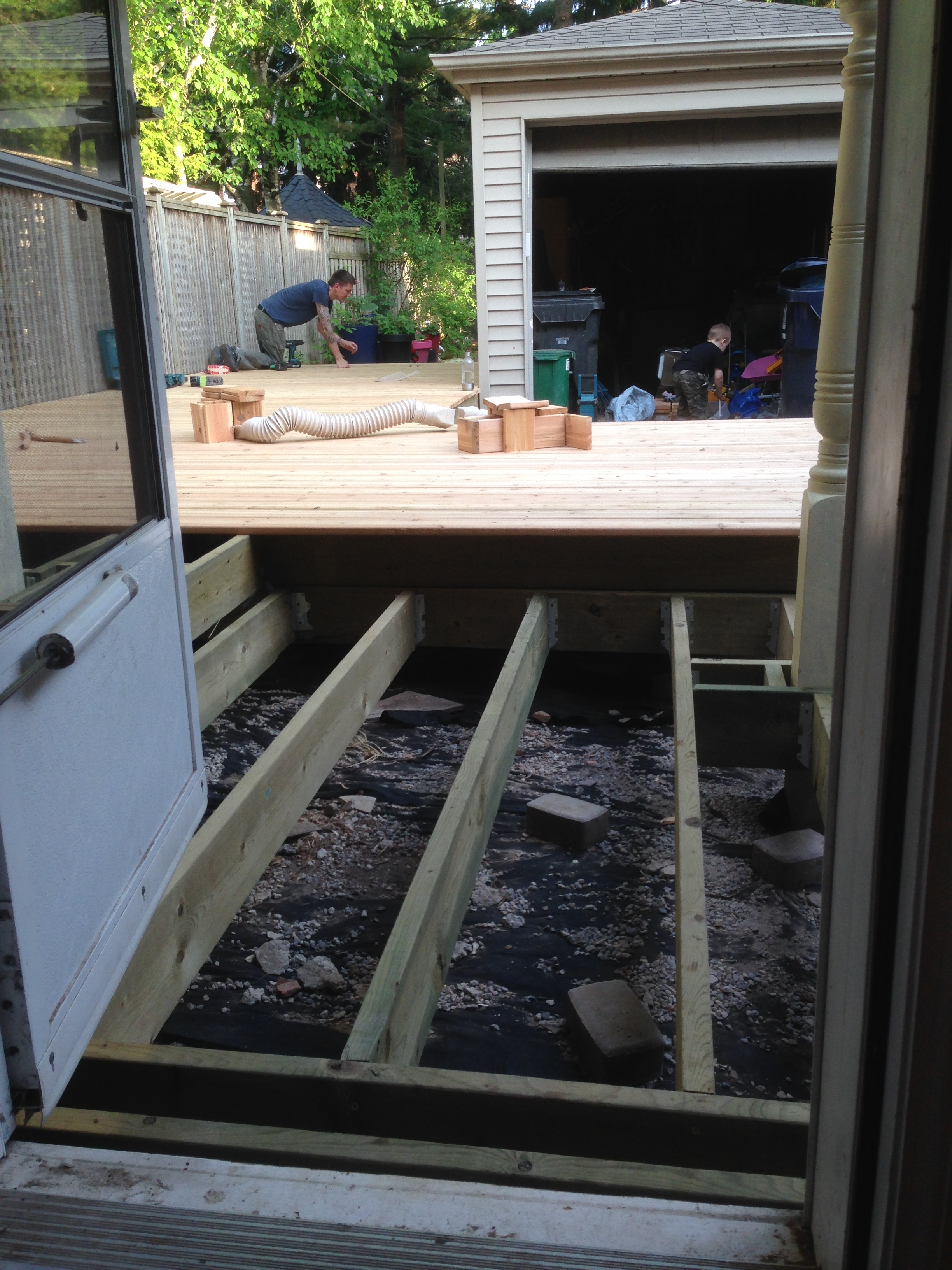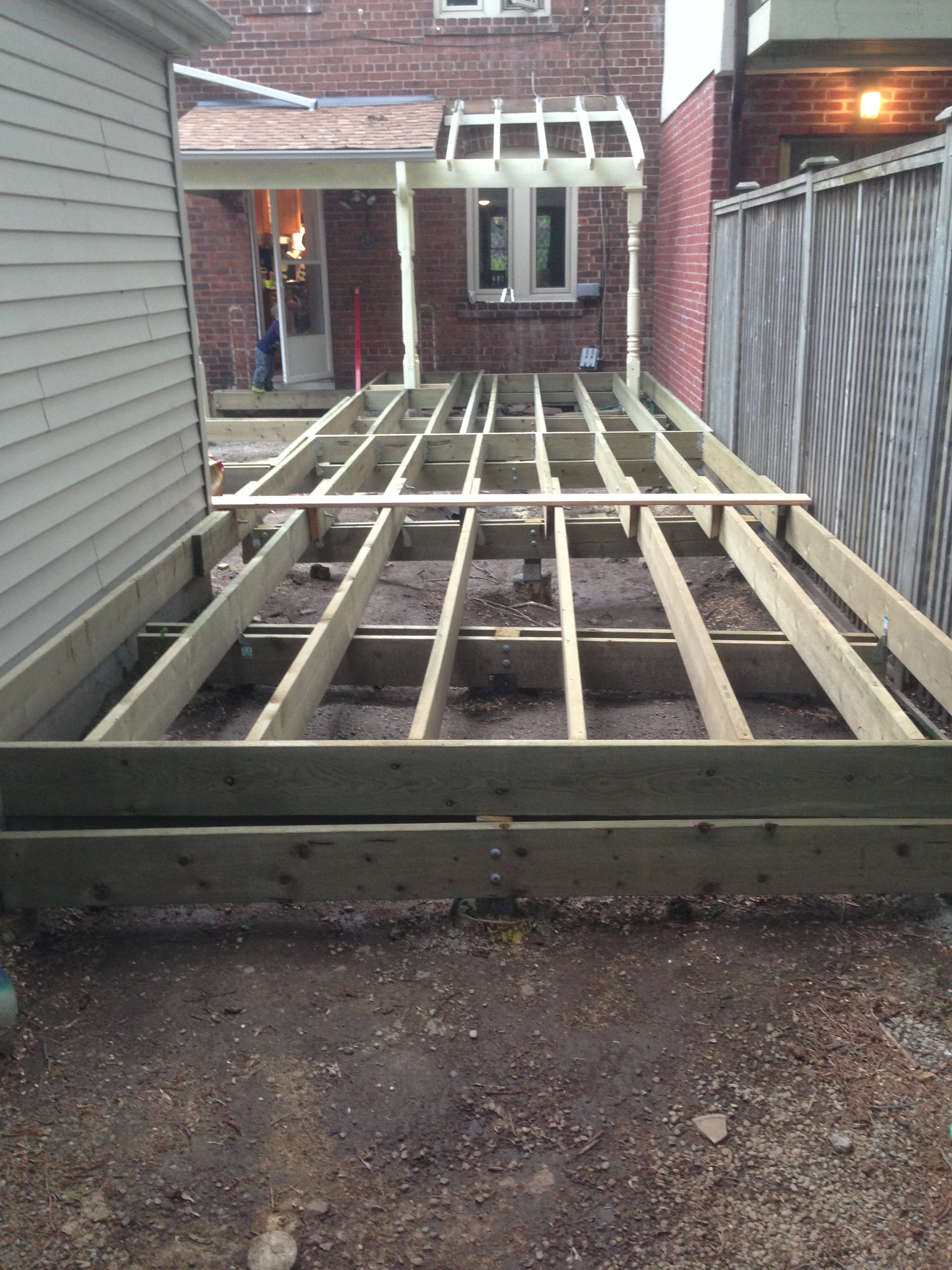 We moved into our new house in May ’13 – The following spring it was decided a major deck was in order. 1 – to keep the kids some what ‘fenced in’ (it was open before and from the back door could walk to the road). Now you can open the door and let them play away in safety. And 2 – the space was unpractical before, especially for 3 young kids. I’d never built a deck before, but I loved every minute of it.